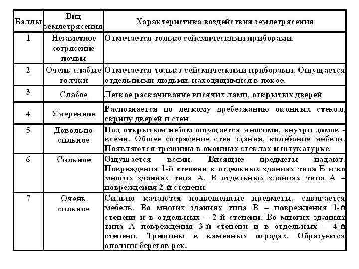 При этом регламентируют 5 степеней повреждения зданий и сооружений: 1 – легкие повреждения (тонкие повреждения в штукатурке и откалывание небольших ее кусков; 2 – умеренные повреждения (небольшие трещины в стенах, откалывание довольно больших кусков штукатурки, падение кровельных черепиц, трещины в дымовых трубах и падение частей дымовых труб); 3 – тяжелые повреждения (глубокие и сквозные трещины в стенах, падение дымовых труб); 4 – разрушения (обрушения внутренних стен и стен заполнения каркаса, проломы в стенах, обрушение частей зданий, разрушение связей между отдельными частями зданий); 5 – обвалы (полное разрушение зданий).