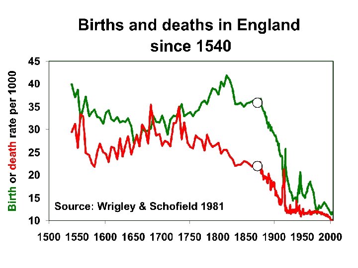 Birth or death rate per 1000 45 Births and deaths in England since 1540 40 35 30 25 20 15 Source: Wrigley & Schofield 1981 10 1500 1550 1600 1650 1700 1750 1800 1850 1900 1950 2000