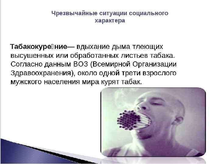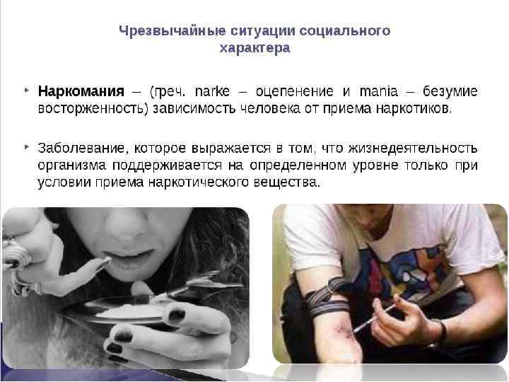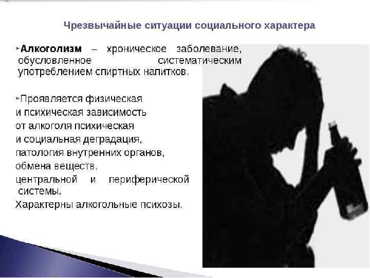 ЧС, связанные с нарушением здоровья u Употребление веществ, которые разрушают организм человека и приносят множество бед и страданий – в семье, коллективе, являются социальным злом для общества. Употребление веществ, разрушающих организм Алкоголизм Наркомания Курение