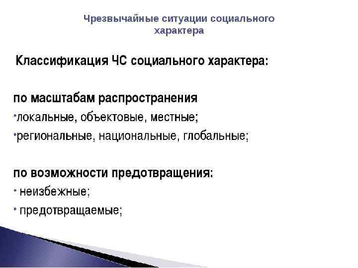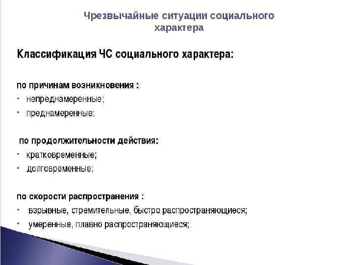 ЧС социального характера u. ЧС социального характера – это обстановка на определенной территории, сложившаяся в результате возникновения опасных противоречий и конфликтов в сфере социальных отношений, которые могут повлечь или повлекли за собой человеческие жертвы, ущерб здоровью людей или окружающей среде, значительные материальные потери или нарушение условий жизнедеятельности людей.