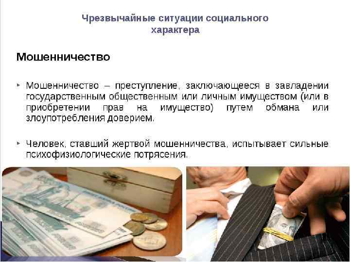 Как не стать жертвой мошенников: Основные приемы самозащиты • всегда будьте начеку и умейте распознавать источники опасности, чтобы не быть застигнутым врасплох; • старайтесь всегда находиться в хорошей физической форме и психологически будьте готовы к возможной опасной ситуации; • не падайте духом и в любой ситуации ищите выход; • постоянно имейте под рукой телефон ближайшего отделения милиции; • научитесь технике самообороны и при необходимости защищайте себя самым решительным образом; • не вступайте в контакт с незнакомыми людьми, особенно с теми, которые вызывают подозрение; • будьте особенно бдительны и внимательны в местах повышенной криминогенной опасности; • затрудняйте, насколько это возможно, действия злоумышленников, так каждое препятствие ставит перед ними задачи и для их разрешения требуется время.