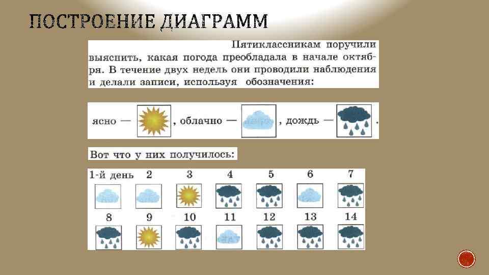 • Эти данные можно изобразить в виде столбчатой диаграммы. • На диаграмме хорошо видно, что в начале октября погода в основном была дождливой или облачной.