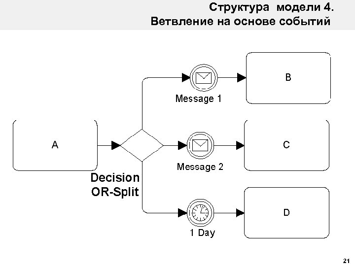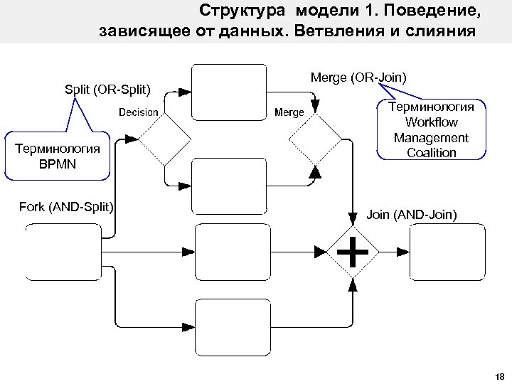Структура модели 1. Поведение, зависящее от данных. Ветвления и слияния Split (OR-Split) Терминология BPMN Fork (AND-Split) Merge (OR-Join) Терминология Workflow Management Coalition Join (AND-Join) 18