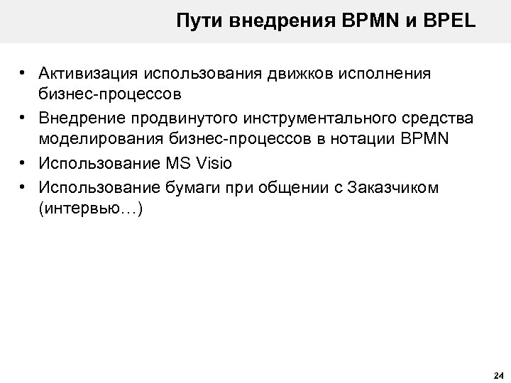 Пути внедрения BPMN и BPEL • Активизация использования движков исполнения бизнес-процессов • Внедрение продвинутого инструментального средства моделирования бизнес-процессов в нотации BPMN • Использование MS Visio • Использование бумаги при общении с Заказчиком (интервью…) 24