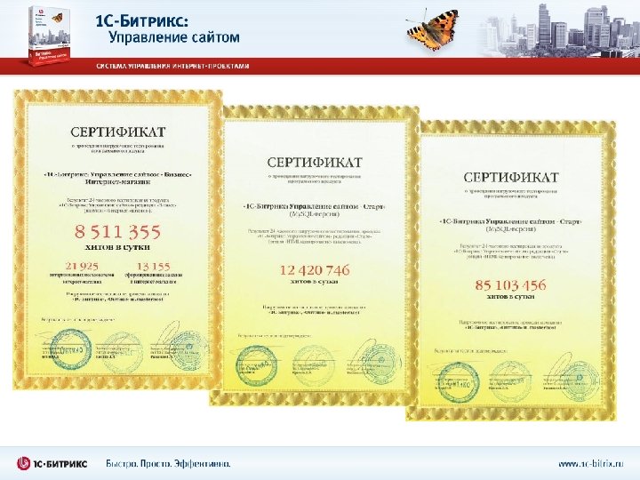 Нагрузочное тестирование было проведено в 2010 году совместно с компаниями «Онтико» и. masterhost. Тестировалась версия 9. 5 (My. SQL), редакции «Старт» и «Бизнес» . На типовом оборудовании 2010 года – на выделенном сервере HP Pro. Liant DL 120: • 8 511 355 хитов в сутки на редакции «Бизнес» • 12 420 746 хитов в сутки на редакции «Старт» • 85 103 456 хитов в сутки на редакции «Старт» (с включенной опцией «HTML кеширование» )