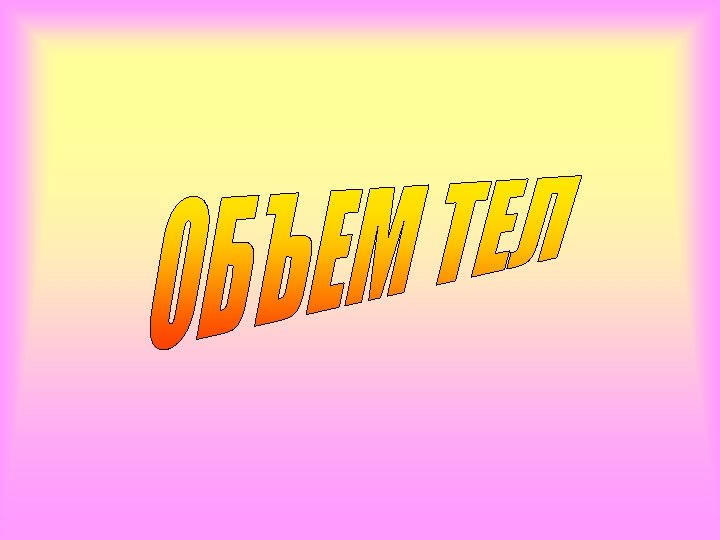 Понятие объема в пространстве вводится аналогично понятию площади для фигур на плоскости. Определение 1. объемом тела называется положительная величина, характеризующая часть пространства, занимаемую телом, и обладающая следующими свойствами: • равные тела имеют равные объемы; при параллельном переносе тела его объем не изменяется; • если тело разбить на части, являющиеся простыми телами, то объем тела равен объему его частей; • за единицу объема принят объем куба, ребро которого равно единице длины; Определение 2. Тела с равными объемами называются равновеликими. Из свойства 2 следует, что если тело с объемом V 1 содержится внутри тела с объемом V 2, то V 1 < V 2.