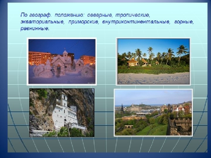 По географическому положению: с приморским положением; n полуостровные; n островные n страны-архипелаги n внутриконтинентальные (42 страны) Задание: Приведите примеры таких стран. n