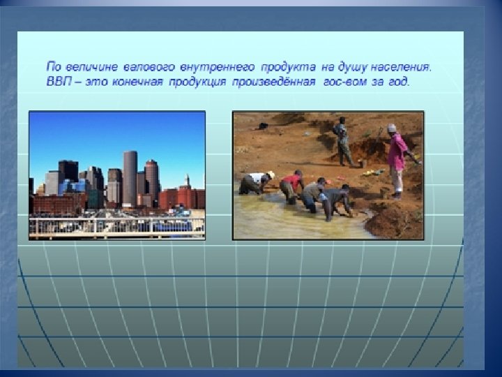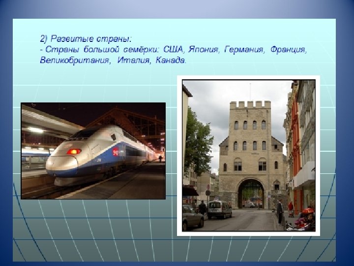 Классификация стран по социально – экономическому признаку. Развитые страны «Большая восьмёрка» Менее крупные Внеевропейские страны Западной страны Европы США, Япония, Германия, Франция, Великобритания, Италия, Канада, Россия Норвегия, Испания, Греция, Дания… Австралия, Новая Зеландия, ЮАР, Израиль Страны 1997 г Южная Корея, Сингапур, Тайвань