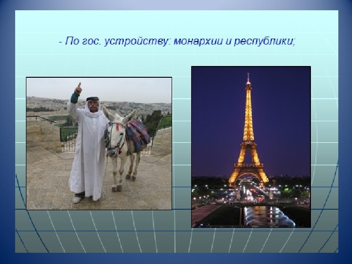 Классификация стран по различным признакам. Признаки различия По географическим признакам По социально экономическому признаку По форме правления По административнотерриториальному устройству