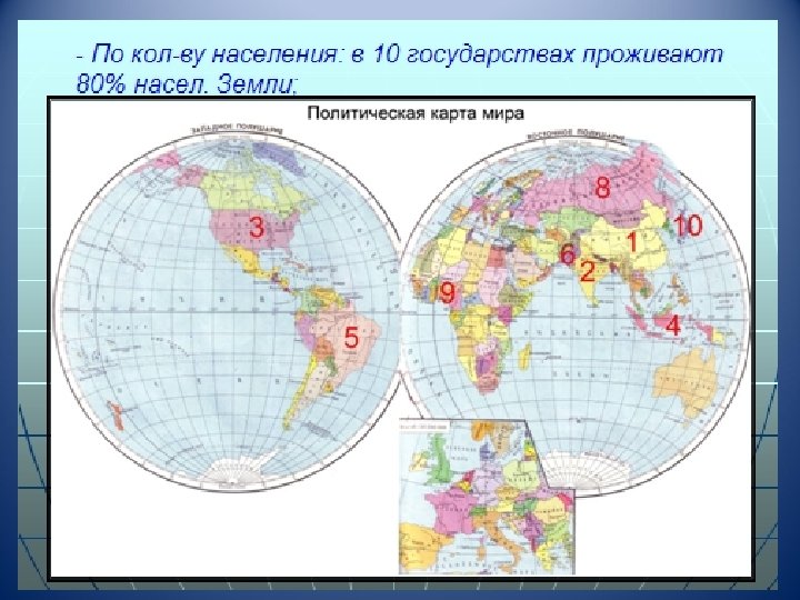 По численности населения n n n Страны-гиганты - свыше 100 млн чел. Средние страны Крошечные – 10 -30 млн чел.