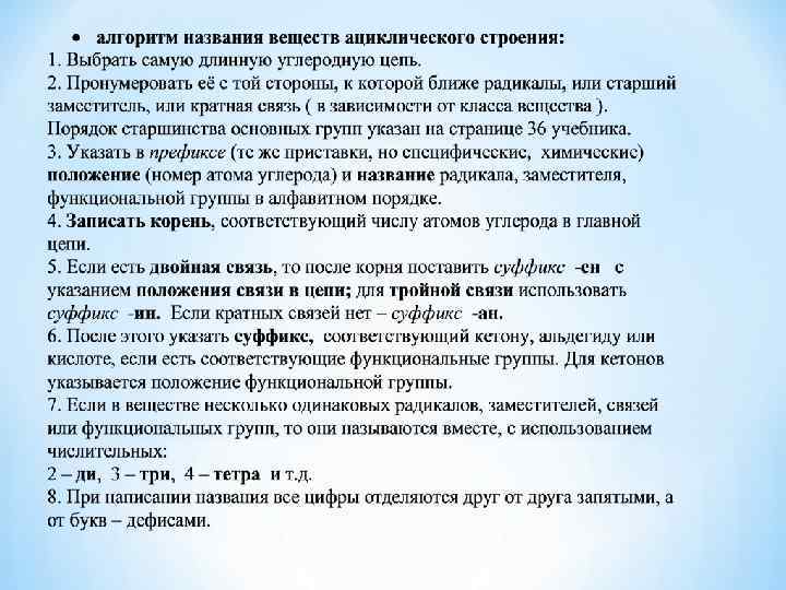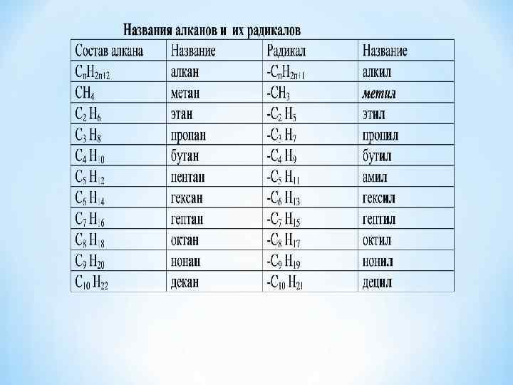 * Для того чтобы уметь пользоваться ею, нужно совсем немного: * Знать сведения таблицы 3. «Основные классы органических соединений» и уметь ими пользоваться. ( Перепишите на плотную бумагу эту таблицу, сделайте себе карточку-подсказку). * Хорошо знать названия первых представителей гомологического ряда предельных углеводородов (от метана до декана) и радикалов. (Сделайте на обратной стороне другую карточку-подсказку): *