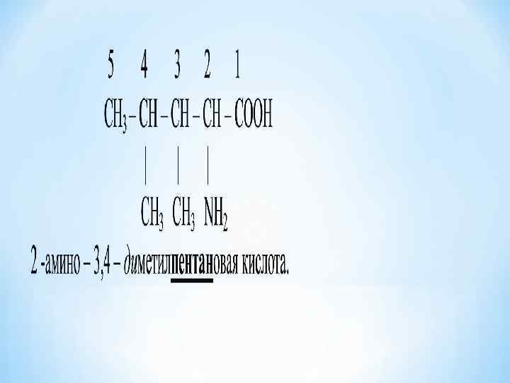 *. Поскольку в главной цепи пять атомов углерода, основа названия - пентан. * 2. В молекуле есть функциональная группа – -СООН карбоксильная . На её присуствие указывает -овая кислота * 3. В главной цепи есть три заместителя: * амино –группа, её положение указывается цифрой 2, * и две метильные группы. На число метильных групп указывает частица ди-, а на положение в цепи цифры 3, 4. Между цифрами есть запятая, цифры от букв отделены дефисом.