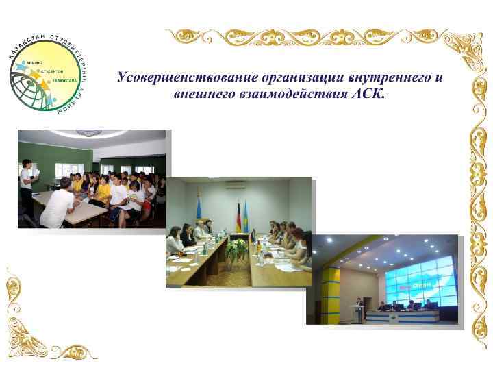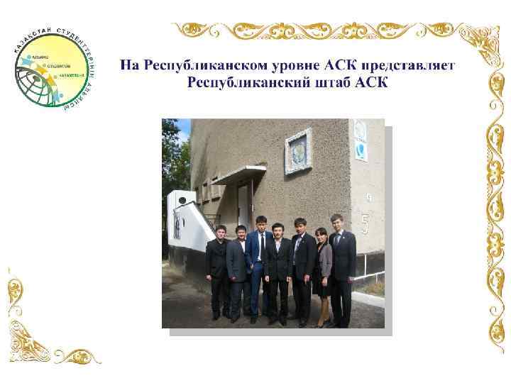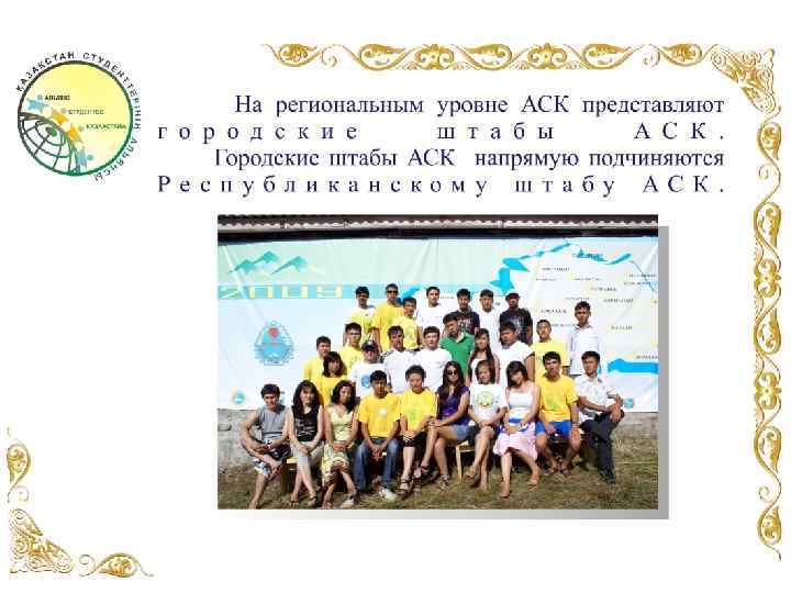 СТУКТУРА РЕСПУБЛИКАНСКОГО ШТАБА АЛЬЯНСА СТУДЕНТОВ КАЗАХСТАНА РЕСПУБЛИКАНСКИЙ ЛИДЕР АЛЬЯНСА СТУДЕНТОВ КАЗАХСТАНА 1 -ый вице - лидер Координатор Республиканского штаба АСК Координатор по хозяйственному обеспечению 2 -ой вице - лидер Координатор по организации мероприятий Координатор по имиджевой продукции ГОРОДСКИЕ ШТАБЫ АСК г. Шымкент г. Кызылорда г. Тараз г. Туркестан г. Жезказган г. Жетысай г. Актобе г. Актау г. Атырау г. Орал г. Аркалык г. Жанаозен г. Усть-Каменогорск г. Семей г. Караганда г. Темиртау г. Талдыкорган г. Балхаш г. Павлодар г. Петропавловск г. Кокшетау г. Экибастуз г. Кустанай г. Рудный