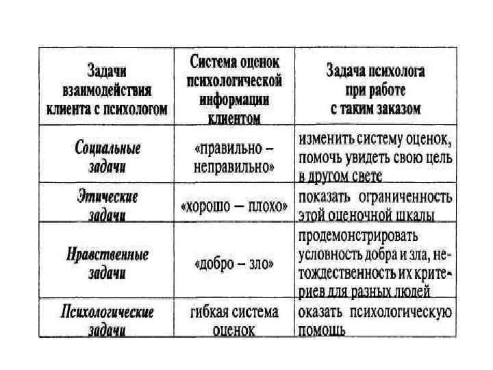 Работа практического психолога состоит в том, чтобы добиться от клиентов переформулирования задач первых трех типов в задачи психологические. Лишь тогда практический психолог окажется способным оказать реальную помощь клиенту в решении его проблем.