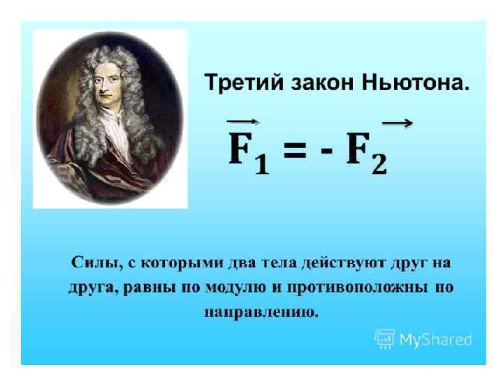 Второй закон Ньютона. • Сила, действующая на тело, равна произведению массы тела на создаваемое этой силой ускорение, причем направления силы и ускорения совпадают: • F = ma Третий закон Ньютона. • Сила действия равна силе противодействия: F 1 = -F 2