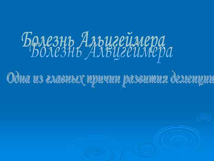 Что такое болезнь Альцгеймера Болезнь Альцгеймера (также сенильная деменция альцгеймеровского типа) — наиболее распространённая форма деменции, неизлечимое дегенеративное заболевание, впервые описанное в 1906 году немецким психиатром Алоисом Альцгеймером. Ø Как правило, она обнаруживается у людей старше 65 лет, но существует и ранняя болезнь Альцгеймера — редкая форма заболевания. Общемировая заболеваемость на 2006 год оценивалась в 26. 6 млн человек, а к 2050 году число больных может вырасти вчетверо. Ø