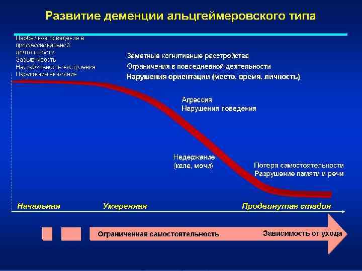 Умеренная деменция Ø Способность к независимым действиям снижается из-за прогрессирующего ухудшения состояния. Расстройства речи становятся очевидными, так как с потерей доступа к словарному запасу человек все чаще подбирает неверные слова на замену забытым (парафразия). Также идет потеря навыков чтения и письма. Со временем всё более нарушается координация при выполнении сложных последовательностей движений, что снижает способность человека справляться с большинством повседневных задач. На этом этапе усиливаются проблемы с памятью, и больной может не узнавать близких родственников. Прежде нетронутая долговременная память также нарушается и отклонения в поведении становятся более заметными. Обычными являются такие нейропсихиатрические проявления как бродяжничество, вечернее обострение, раздражительность и эмоциональная лабильность, проявляющаяся в плаче, спонтанной агрессии, или в сопротивлении уходу. Синдром ложной идентификации и другие симптомы бреда развиваются примерно у 30 % пациентов. Может развиться недержание мочи. У родственников больного и ухаживающих за ним лиц эти симптомы вызывают стресс, который может быть смягчён перемещением пациента из под домашнего присмотра в стационарное заведение.