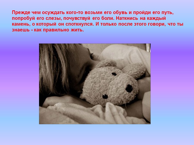 Прежде чем осуждать кого-то возьми его обувь и пройди его путь, попробуй его слезы, почувствуй его боли. Наткнись на каждый камень, о который он споткнулся. И только после этого говори, что ты знаешь - как правильно жить.