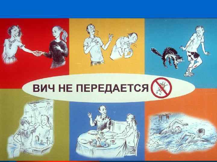 Нельзя заразиться ВИЧ l l l Воздушно-капельным путем (при кашле или чихании) Через укусы насекомых Через прикосновения или объятия Через поцелуи При посещении плавательных бассейнов и других мест общественного купания При посещении общественного туалета При рукопожатиях При контактах с ВИЧ-инфицированным на работе, в школе или дома При пользовании общим телефоном Через питьевую воду и еду, а также приготовлении пищи При совместном использовании чашек, стаканов, тарелок и иную столовую посуду и предметы