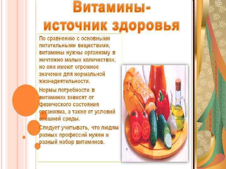 Что такое витамины ? Витамины — это органические соединения, разнообразные по своему химическому составу, которые имеют низкий уровень молекул. В переводе с латинского языка (vita жизнь). Витамины необходимы всем живым организмам для поддержания здоровой жизнедеятельности. Они благотворно влияют на обмен веществ. Некоторые витамины уже существуют в организме животных и людей. Человек получает необходимые витамины как в пище, так и в лекарственных препаратах.