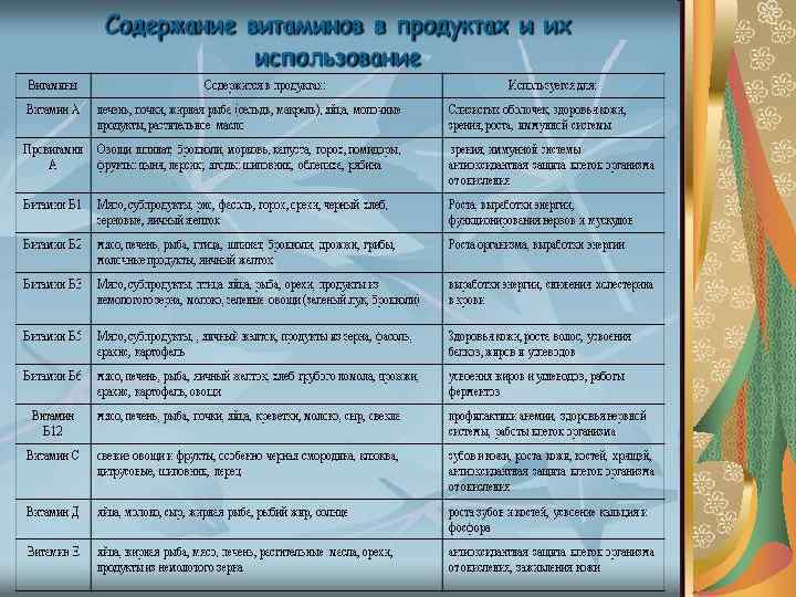 Витамин А. Собственно витамин А – ретинол. Вторая форма провитамин А может образовываться в организме из каротина (получил название от слова «каротель» морковь). Источники витамина А имеют животное происхождение. Основные – печень и почки животных, рыбий жир, яичный желток, молочные продукты. Источники каротина имеют растительное происхождение. К главным относятся: морковь, картофель, капуста всех видов, зеленые и желтые овощи, все желтые фрукты. Витамин А, содержащийся овощах, фруктах и зелени, лучше усваивается, если принимать их с растительным маслом, сметаной или сливками. 100 г моркови или репы обеспечат суточную потребность витамина А. Существенные источники витамина В 1 – проросшие зерна пшеницы, отруби, пивные дрожжи. Также богаты тиамином семечки подсолнечника, фасоль и картофель. Есть он также в мясе, рыбе, яйцах, твороге, черном хлебе, крупах (гречневой, овсяной, ячменной, пшеничной), коричневом рисе, спарже, листовой зелени (укропе, петрушке, салате, кинзе, шпинате), лесных орехах, черной смородине, яблоках. Важнейшие источники витамина В 2: печень и пивные дрожжи. Много его в капусте, свежем горохе, миндале, помидорах, репе, проросшей пшенице. Особенно богаты рибофлавином говядина, творог, сыр, молочные продукты, картофель, яичный желток, лук. Источники витамина В 5: почки, печень, дрожжи пивные и пекарские, яичный желток, мясо, кисломолочные продукты, арахис, салатные овощи, каша из недробленых круп, отруби, овсяные хлопья, гречневая крупа, горох. Пантотеновая кислота легко уничтожается при замораживании и консервировании. Витамина В 6 больше всего содержится, как и прочих витаминов группы В, в печени, дрожжах, отрубях, проросшей пшенице. Его много в картофеле, мясе, рыбе, в яичном желтке, капусте, моркови, фасоли, бананах. Часть витамина В 6 теряется при замораживании, консервировании и переработке. Витамин В 9 впервые получен из листьев шпината, поэтому свое название получил от латинского слова «фолиум» , что означает «лист» . Кроме зеленых листовых овощей (салата, шпината, капусты, зеленого лука) его источником являются бобовые, свекла, томаты, морковь, пшено, дрожжи, гречневая и овсяная крупы. А из продуктов животного происхождения фолиевой кислотой богаты почки, печень. В молоке, мясе и яйцах витамина В 9 мало. Наилучшие источники витамина В 12 – печень говяжья и телячья (10 20 г содержат суточную норму). В 12 содержат кисломолочные продукты, соя, яичный желток, пекарские и пивные дрожжи. А также зеленый лук, шпинат, проросшая пшеница. А еще продукты моря – кальмары, морская капуста, креветки. При нагревании теряется часть кобаламина. Поскольку в продуктах растительного происхождения практически его не содержится, то у вегетарианцев может появиться его гиповитаминоз В 12. Усваивается он лучше с фолиевой кислотой и кальцием.