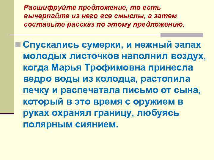 Расшифруйте предложение, то есть вычерпайте из него все смыслы, а затем составьте рассказ по этому предложению. n Спускались сумерки, и нежный запах молодых листочков наполнил воздух, когда Марья Трофимовна принесла ведро воды из колодца, растопила печку и распечатала письмо от сына, который в это время с оружием в руках охранял границу, любуясь полярным сиянием.