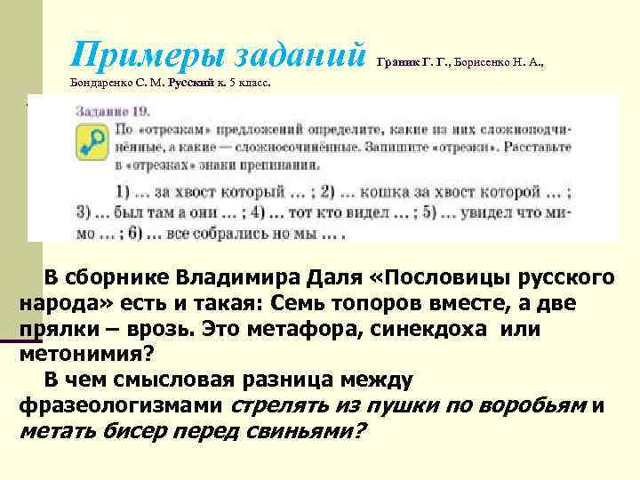 Примеры заданий Граник Г. Г. , Борисенко Н. А. , Бондаренко С. М. Русский к. 5 класс. В сборнике Владимира Даля «Пословицы русского народа» есть и такая: Семь топоров вместе, а две прялки – врозь. Это метафора, синекдоха или метонимия? В чем смысловая разница между фразеологизмами стрелять из пушки по воробьям и метать бисер перед свиньями?