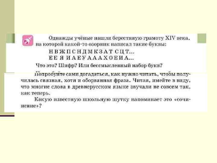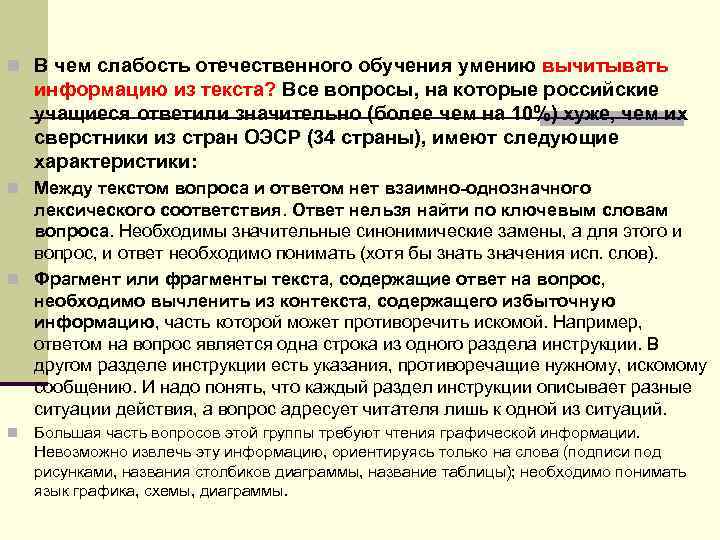 n В чем слабость отечественного обучения умению вычитывать информацию из текста? Все вопросы, на которые российские учащиеся ответили значительно (более чем на 10%) хуже, чем их сверстники из стран ОЭСР (34 страны), имеют следующие характеристики: n Между текстом вопроса и ответом нет взаимно-однозначного лексического соответствия. Ответ нельзя найти по ключевым словам вопроса. Необходимы значительные синонимические замены, а для этого и вопрос, и ответ необходимо понимать (хотя бы знать значения исп. слов). n Фрагмент или фрагменты текста, содержащие ответ на вопрос, необходимо вычленить из контекста, содержащего избыточную информацию, часть которой может противоречить искомой. Например, ответом на вопрос является одна строка из одного раздела инструкции. В другом разделе инструкции есть указания, противоречащие нужному, искомому сообщению. И надо понять, что каждый раздел инструкции описывает разные ситуации действия, а вопрос адресует читателя лишь к одной из ситуаций. n Большая часть вопросов этой группы требуют чтения графической информации. Невозможно извлечь эту информацию, ориентируясь только на слова (подписи под рисунками, названия столбиков диаграммы, название таблицы); необходимо понимать язык графика, схемы, диаграммы.