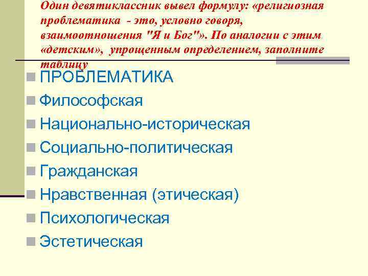 Один девятиклассник вывел формулу: «религиозная проблематика - это, условно говоря, взаимоотношения "Я и Бог"» . По аналогии с этим «детским» , упрощенным определением, заполните таблицу n ПРОБЛЕМАТИКА n Философская n Национально историческая n Социально политическая n Гражданская n Нравственная (этическая) n Психологическая n Эстетическая
