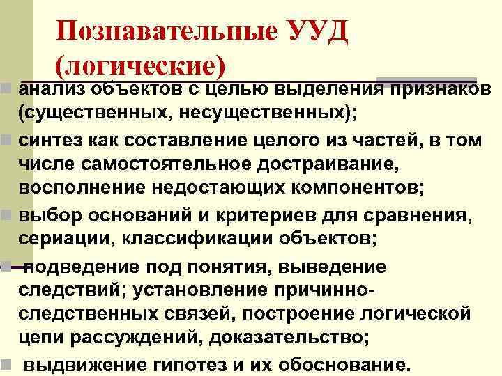 Познавательные УУД (логические) n анализ объектов с целью выделения признаков (существенных, несущественных); n синтез как составление целого из частей, в том числе самостоятельное достраивание, восполнение недостающих компонентов; n выбор оснований и критериев для сравнения, сериации, классификации объектов; n подведение под понятия, выведение следствий; установление причинноследственных связей, построение логической цепи рассуждений, доказательство; n выдвижение гипотез и их обоснование.