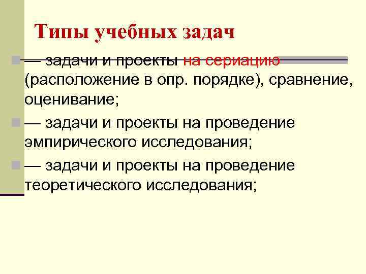 Типы учебных задач n — задачи и проекты на сериацию (расположение в опр. порядке), сравнение, оценивание; n — задачи и проекты на проведение эмпирического исследования; n — задачи и проекты на проведение теоретического исследования;