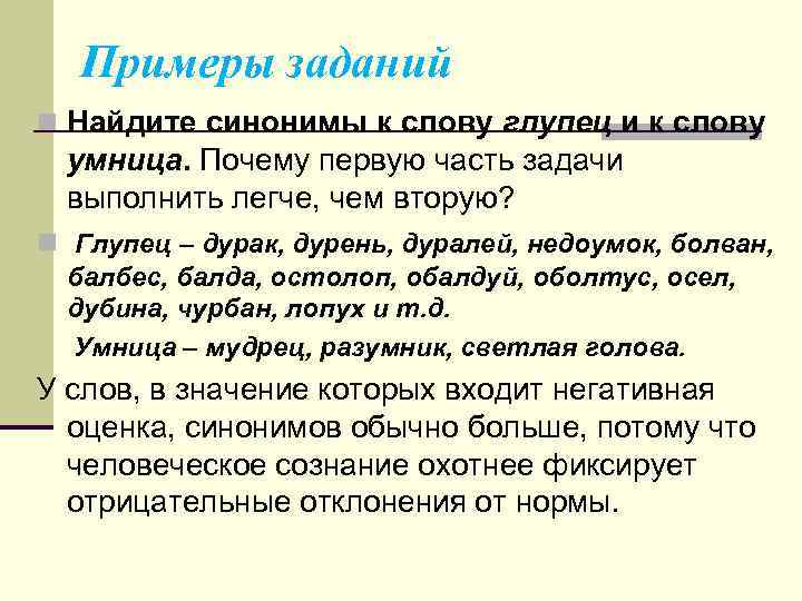 Примеры заданий n Найдите синонимы к слову глупец и к слову умница. Почему первую часть задачи выполнить легче, чем вторую? n Глупец – дурак, дурень, дуралей, недоумок, болван, балбес, балда, остолоп, обалдуй, оболтус, осел, дубина, чурбан, лопух и т. д. Умница – мудрец, разумник, светлая голова. У слов, в значение которых входит негативная оценка, синонимов обычно больше, потому что человеческое сознание охотнее фиксирует отрицательные отклонения от нормы.