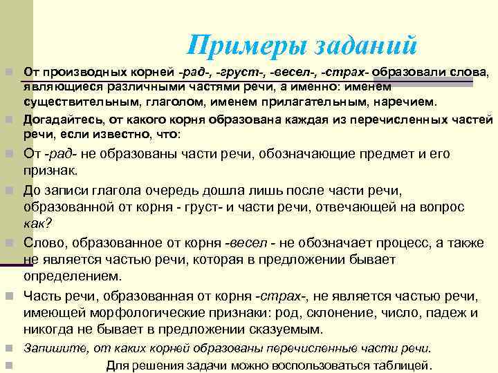 Примеры заданий n От производных корней -рад-, -груст-, -весел-, -страх- образовали слова, являющиеся различными частями речи, а именно: именем существительным, глаголом, именем прилагательным, наречием. n Догадайтесь, от какого корня образована каждая из перечисленных частей речи, если известно, что: n От -рад- не образованы части речи, обозначающие предмет и его признак. n До записи глагола очередь дошла лишь после части речи, образованной от корня груст- и части речи, отвечающей на вопрос как? n Слово, образованное от корня -весел - не обозначает процесс, а также не является частью речи, которая в предложении бывает определением. n Часть речи, образованная от корня -страх-, не является частью речи, имеющей морфологические признаки: род, склонение, число, падеж и никогда не бывает в предложении сказуемым. n Запишите, от каких корней образованы перечисленные части речи. n Для решения задачи можно воспользоваться таблицей.