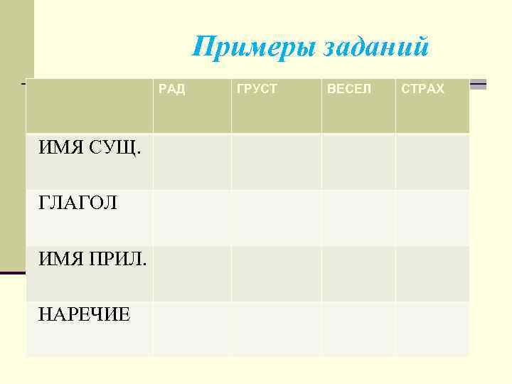 Примеры заданий РАД ИМЯ СУЩ. ГЛАГОЛ ИМЯ ПРИЛ. НАРЕЧИЕ ГРУСТ ВЕСЕЛ СТРАХ