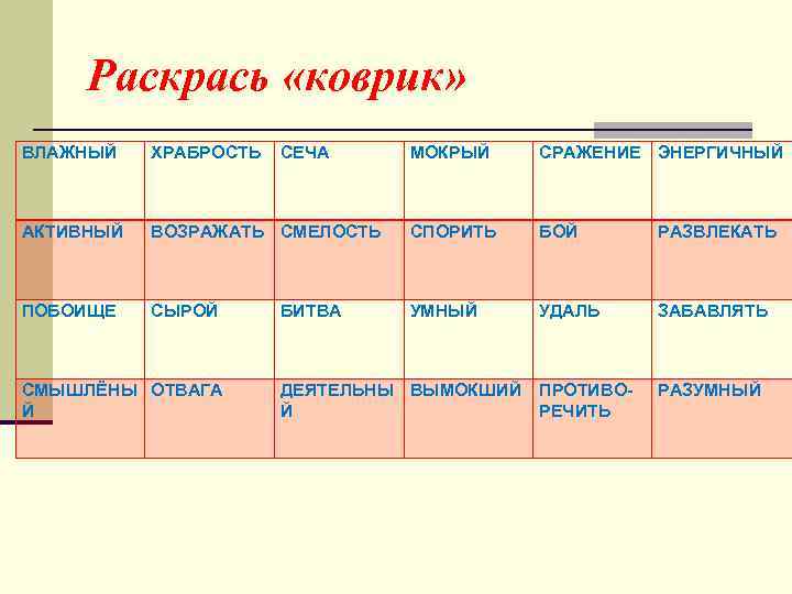 Раскрась «коврик» ВЛАЖНЫЙ ХРАБРОСТЬ АКТИВНЫЙ ПОБОИЩЕ МОКРЫЙ СРАЖЕНИЕ ЭНЕРГИЧНЫЙ ВОЗРАЖАТЬ СМЕЛОСТЬ СПОРИТЬ БОЙ РАЗВЛЕКАТЬ СЫРОЙ УМНЫЙ УДАЛЬ ЗАБАВЛЯТЬ СМЫШЛЁНЫ ОТВАГА Й СЕЧА БИТВА ДЕЯТЕЛЬНЫ ВЫМОКШИЙ ПРОТИВОЙ РЕЧИТЬ РАЗУМНЫЙ