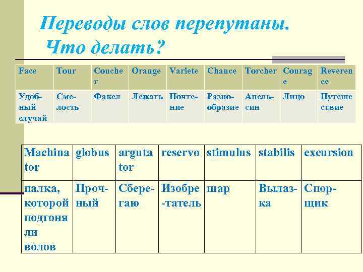 Переводы слов перепутаны. Что делать? Face Tour Couche Orange Variete Chance Torcher Courag Reveren r e ce Удобный случай Смелость Факел Лежать Почтение Разно- Апель- Лицо образие син Путеше ствие Machina globus arguta reservo stimulus stabilis excursion tor палка, Проч- Сбере- Изобре шар которой ный гаю -татель подгоня ли волов Вылаз- Спорка щик