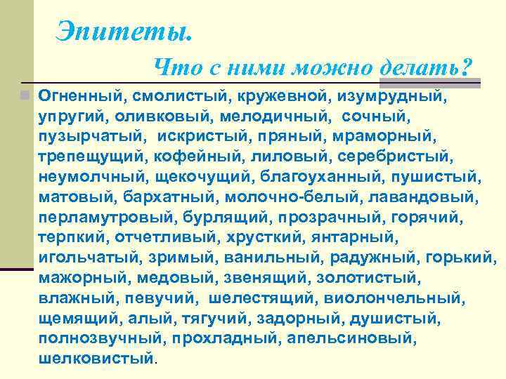 Эпитеты. Что с ними можно делать? n Огненный, смолистый, кружевной, изумрудный, упругий, оливковый, мелодичный, сочный, пузырчатый, искристый, пряный, мраморный, трепещущий, кофейный, лиловый, серебристый, неумолчный, щекочущий, благоуханный, пушистый, матовый, бархатный, молочно-белый, лавандовый, перламутровый, бурлящий, прозрачный, горячий, терпкий, отчетливый, хрусткий, янтарный, игольчатый, зримый, ванильный, радужный, горький, мажорный, медовый, звенящий, золотистый, влажный, певучий, шелестящий, виолончельный, щемящий, алый, тягучий, задорный, душистый, полнозвучный, прохладный, апельсиновый, шелковистый.