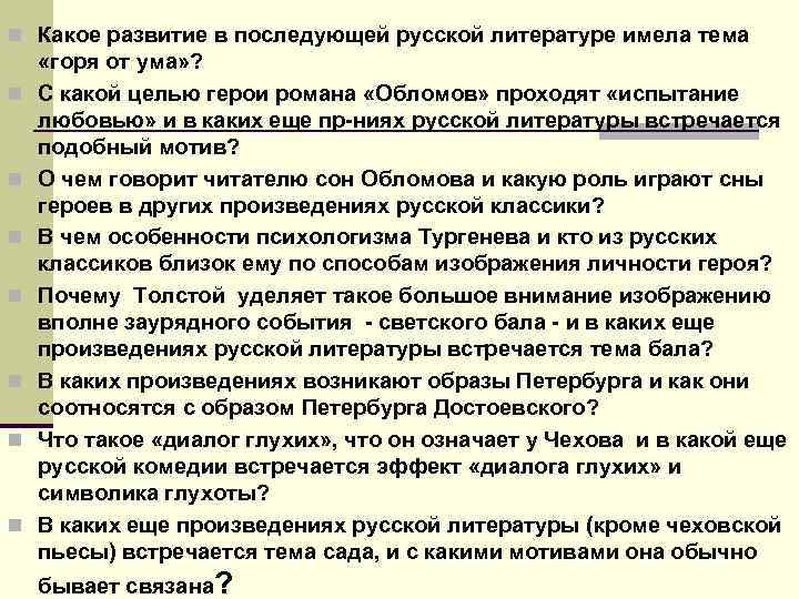 n Какое развитие в последующей русской литературе имела тема n n n n «горя от ума» ? С какой целью герои романа «Обломов» проходят «испытание любовью» и в каких еще пр-ниях русской литературы встречается подобный мотив? О чем говорит читателю сон Обломова и какую роль играют сны героев в других произведениях русской классики? В чем особенности психологизма Тургенева и кто из русских классиков близок ему по способам изображения личности героя? Почему Толстой уделяет такое большое внимание изображению вполне заурядного события - светского бала - и в каких еще произведениях русской литературы встречается тема бала? В каких произведениях возникают образы Петербурга и как они соотносятся с образом Петербурга Достоевского? Что такое «диалог глухих» , что он означает у Чехова и в какой еще русской комедии встречается эффект «диалога глухих» и символика глухоты? В каких еще произведениях русской литературы (кроме чеховской пьесы) встречается тема сада, и с какими мотивами она обычно бывает связана?