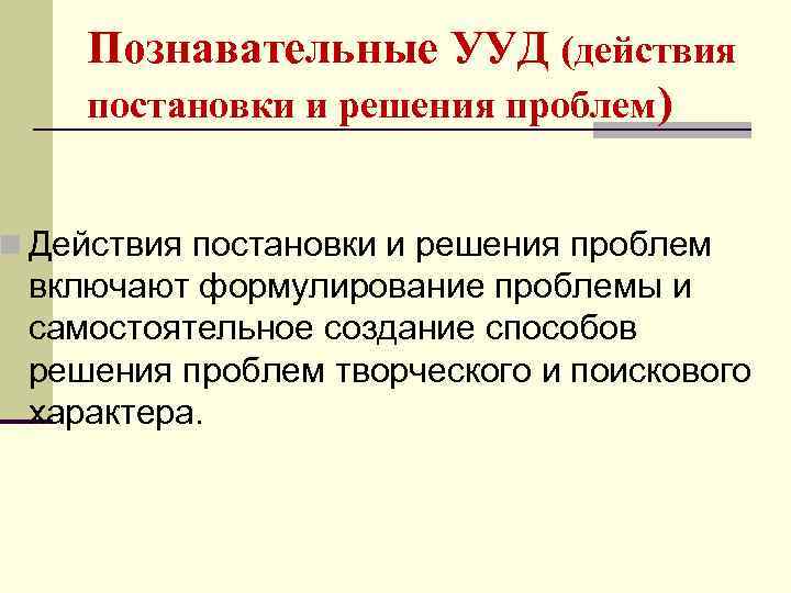 Познавательные УУД (действия постановки и решения проблем) n Действия постановки и решения проблем включают формулирование проблемы и самостоятельное создание способов решения проблем творческого и поискового характера.