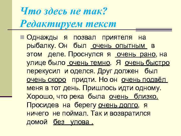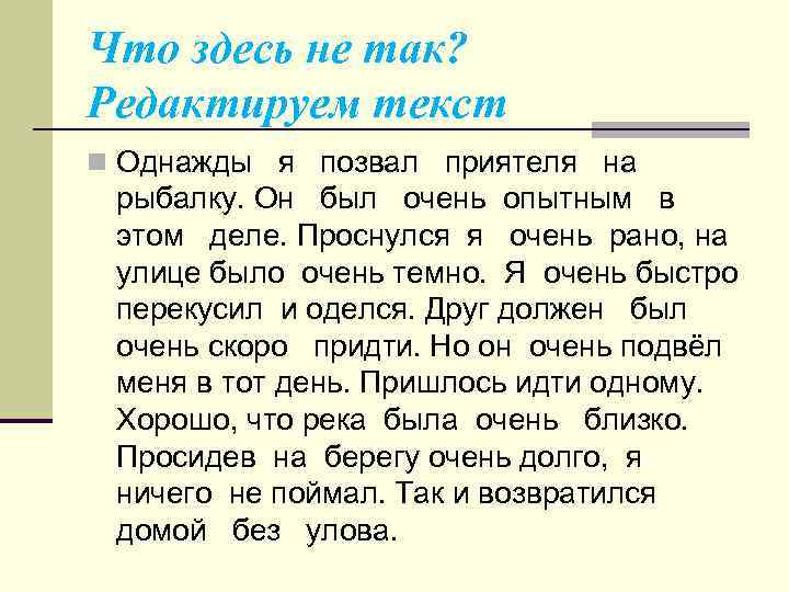 Что здесь не так? Редактируем текст n Однажды я позвал приятеля на рыбалку. Он был очень опытным в этом деле. Проснулся я очень рано, на улице было очень темно. Я очень быстро перекусил и оделся. Друг должен был очень скоро придти. Но он очень подвёл меня в тот день. Пришлось идти одному. Хорошо, что река была очень близко. Просидев на берегу очень долго, я ничего не поймал. Так и возвратился домой без улова.