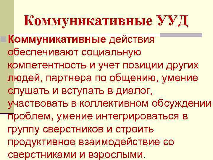 Коммуникативные УУД n Коммуникативные действия обеспечивают социальную компетентность и учет позиции других людей, партнера по общению, умение слушать и вступать в диалог, участвовать в коллективном обсуждении проблем, умение интегрироваться в группу сверстников и строить продуктивное взаимодействие со сверстниками и взрослыми.