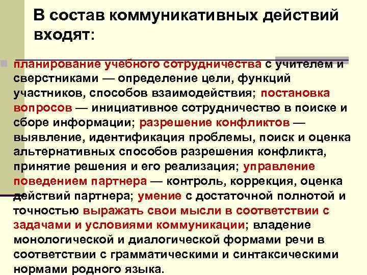 В состав коммуникативных действий входят: n планирование учебного сотрудничества с учителем и сверстниками — определение цели, функций участников, способов взаимодействия; постановка вопросов — инициативное сотрудничество в поиске и сборе информации; разрешение конфликтов — выявление, идентификация проблемы, поиск и оценка альтернативных способов разрешения конфликта, принятие решения и его реализация; управление поведением партнера — контроль, коррекция, оценка действий партнера; умение с достаточной полнотой и точностью выражать свои мысли в соответствии с задачами и условиями коммуникации; владение монологической и диалогической формами речи в соответствии с грамматическими и синтаксическими нормами родного языка.