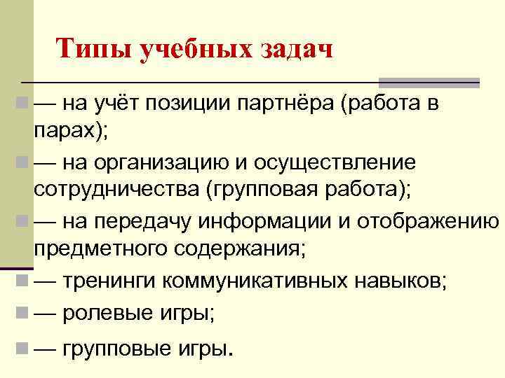 Типы учебных задач n — на учёт позиции партнёра (работа в парах); n — на организацию и осуществление сотрудничества (групповая работа); n — на передачу информации и отображению предметного содержания; n — тренинги коммуникативных навыков; n — ролевые игры; n — групповые игры.