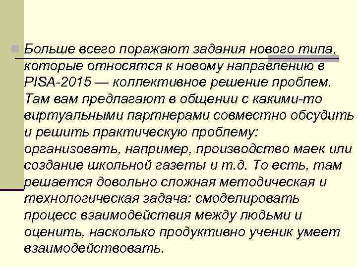 n Больше всего поражают задания нового типа, которые относятся к новому направлению в PISA-2015 — коллективное решение проблем. Там вам предлагают в общении с какими-то виртуальными партнерами совместно обсудить и решить практическую проблему: организовать, например, производство маек или создание школьной газеты и т. д. То есть, там решается довольно сложная методическая и технологическая задача: смоделировать процесс взаимодействия между людьми и оценить, насколько продуктивно ученик умеет взаимодействовать.