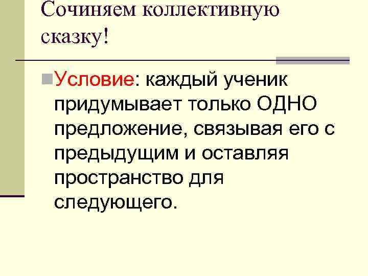Сочиняем коллективную сказку! n. Условие: каждый ученик придумывает только ОДНО предложение, связывая его с предыдущим и оставляя пространство для следующего.