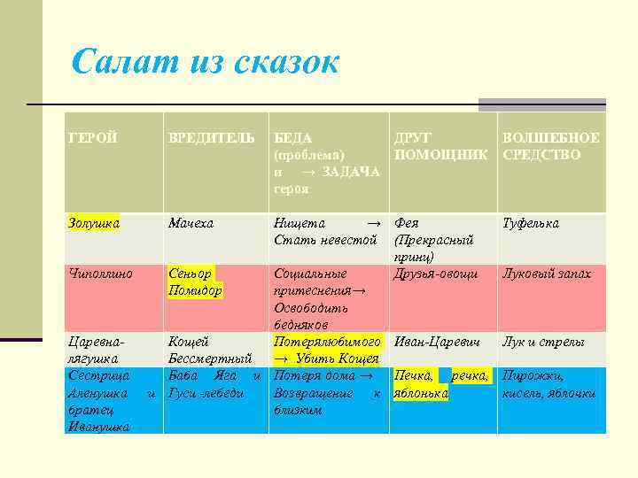 Салат из сказок ГЕРОЙ ВРЕДИТЕЛЬ Золушка Мачеха Чиполлино Царевналягушка Сестрица Аленушка братец Иванушка БЕДА ДРУГ ВОЛШЕБНОЕ (проблема) ПОМОЩНИК СРЕДСТВО и → ЗАДАЧА героя Нищета → Фея Стать невестой (Прекрасный принц) Сеньор Социальные Друзья-овощи Помидор притеснения→ Освободить бедняков Кощей Потеря любимого Иван-Царевич Бессмертный → Убить Кощея Баба Яга и Потеря дома → Печка, речка, и Гуси -лебеди Возвращение к яблонька близким Туфелька Луковый запах Лук и стрелы Пирожки, кисель, яблочки