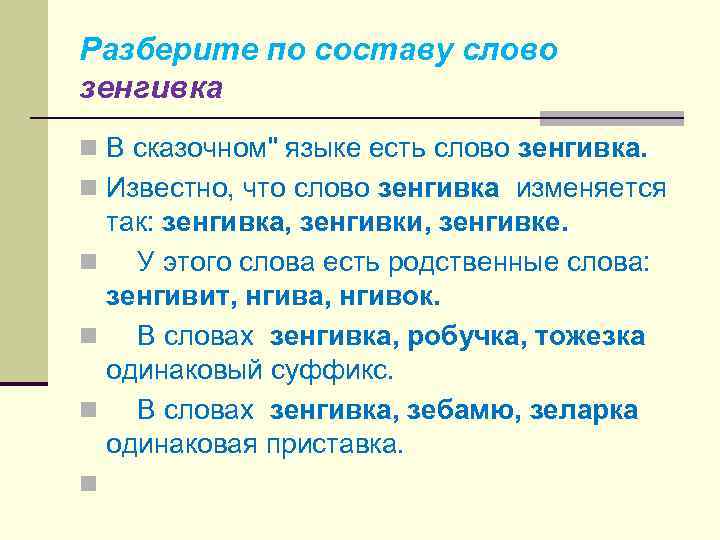 Разберите по составу слово зенгивка n В сказочном" языке есть слово зенгивка. n Известно, что слово зенгивка изменяется так: зенгивка, зенгивки, зенгивке. n У этого слова есть родственные слова: зенгивит, нгива, нгивок. n В словах зенгивка, робучка, тожезка одинаковый суффикс. n В словах зенгивка, зебамю, зеларка одинаковая приставка. n