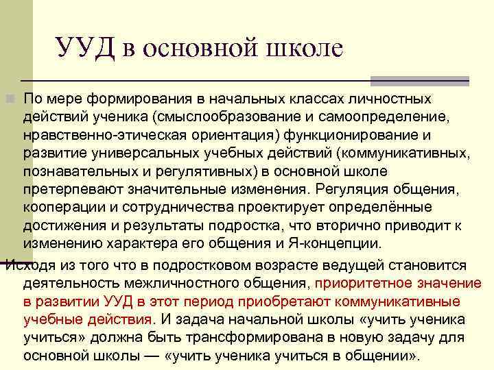УУД в основной школе n По мере формирования в начальных классах личностных действий ученика (смыслообразование и самоопределение, нравственно этическая ориентация) функционирование и развитие универсальных учебных действий (коммуникативных, познавательных и регулятивных) в основной школе претерпевают значительные изменения. Регуляция общения, кооперации и сотрудничества проектирует определённые достижения и результаты подростка, что вторично приводит к изменению характера его общения и Я концепции. Исходя из того что в подростковом возрасте ведущей становится деятельность межличностного общения, приоритетное значение в развитии УУД в этот период приобретают коммуникативные учебные действия. И задача начальной школы «учить ученика учиться» должна быть трансформирована в новую задачу для основной школы — «учить ученика учиться в общении» .
