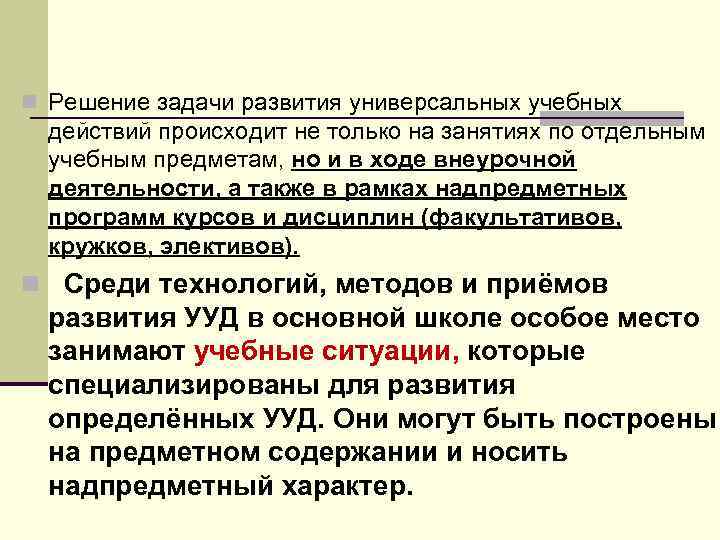 n Решение задачи развития универсальных учебных действий происходит не только на занятиях по отдельным учебным предметам, но и в ходе внеурочной деятельности, а также в рамках надпредметных программ курсов и дисциплин (факультативов, кружков, элективов). n Среди технологий, методов и приёмов развития УУД в основной школе особое место занимают учебные ситуации, которые специализированы для развития определённых УУД. Они могут быть построены на предметном содержании и носить надпредметный характер.