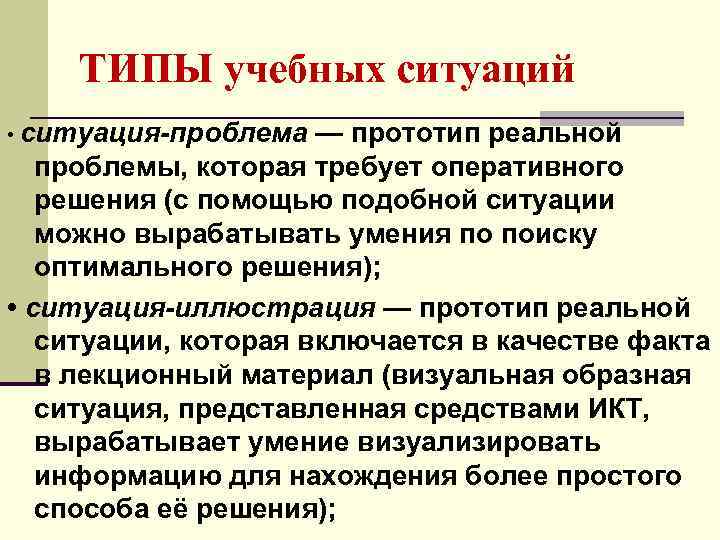 ТИПЫ учебных ситуаций • ситуация-проблема — прототип реальной проблемы, которая требует оперативного решения (с помощью подобной ситуации можно вырабатывать умения по поиску оптимального решения); • ситуация-иллюстрация — прототип реальной ситуации, которая включается в качестве факта в лекционный материал (визуальная образная ситуация, представленная средствами ИКТ, вырабатывает умение визуализировать информацию для нахождения более простого способа её решения);